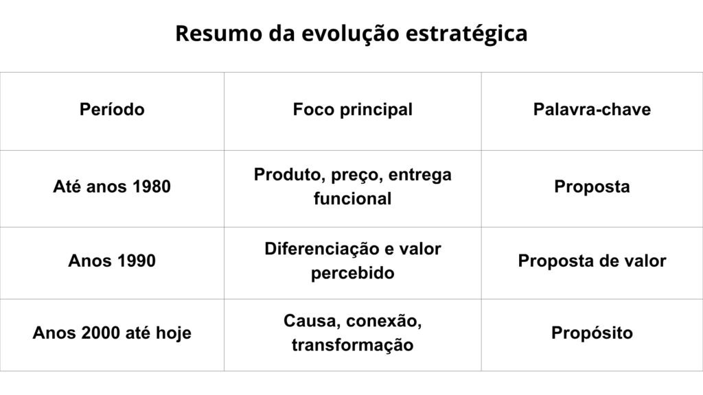 Foi aí que o propósito passou a fazer parte da estratégia. Marcas como Patagonia, Tesla, Natura e movimentos como o “Start With Why” de Simon Sinek reforçaram essa tendência. Mas, com isso, muitas empresas passaram a usar “propósito” só como discurso e esqueceram da entrega real, da proposta.